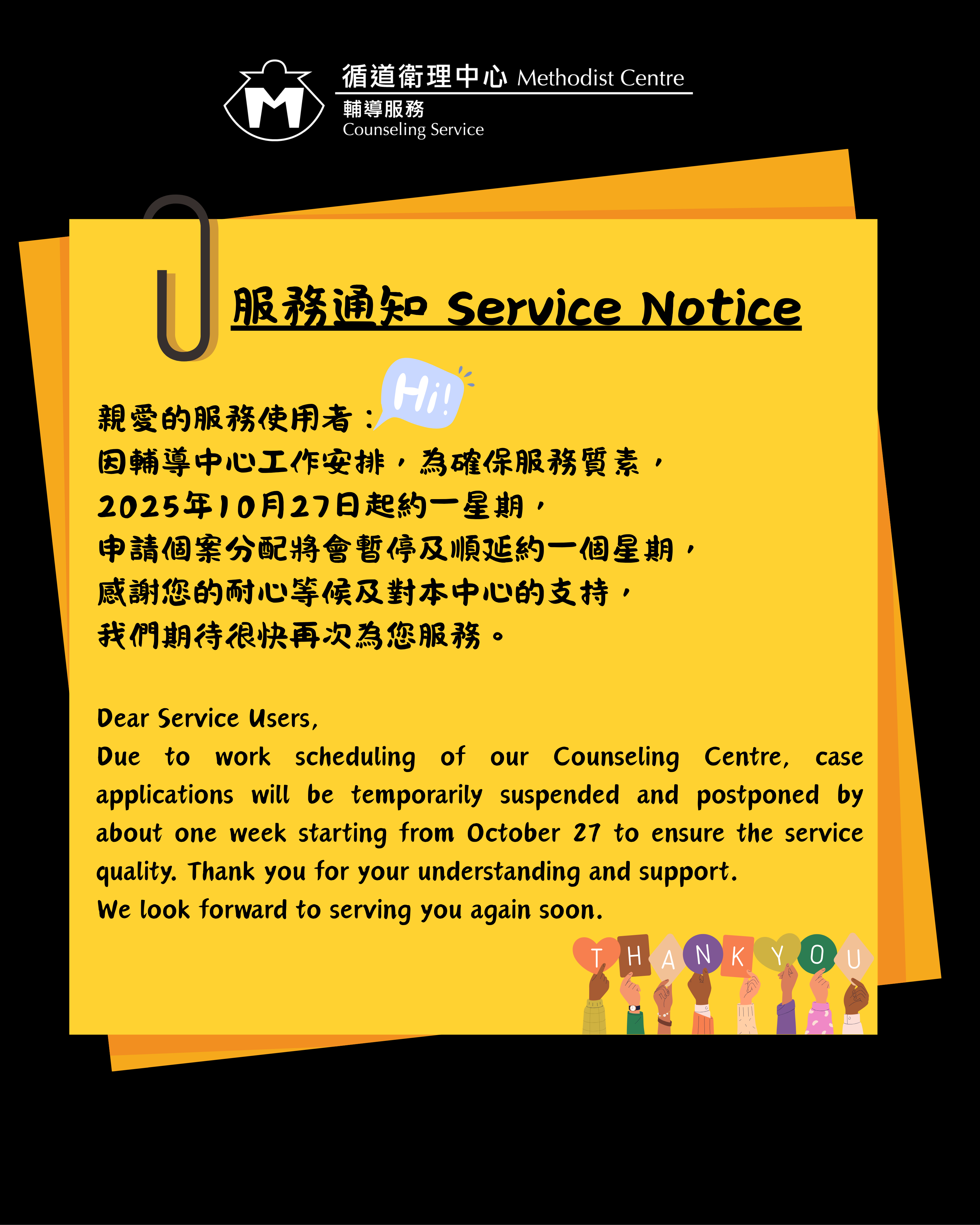 親愛的服務使用者: 因輔導中心工作安排,為確保服務質素,10月27日起約一星期,申請個案分配將會暫停及順延約一個星期,感謝您的耐心等候及對本中心的支持,我們期待很快再次為您服務。