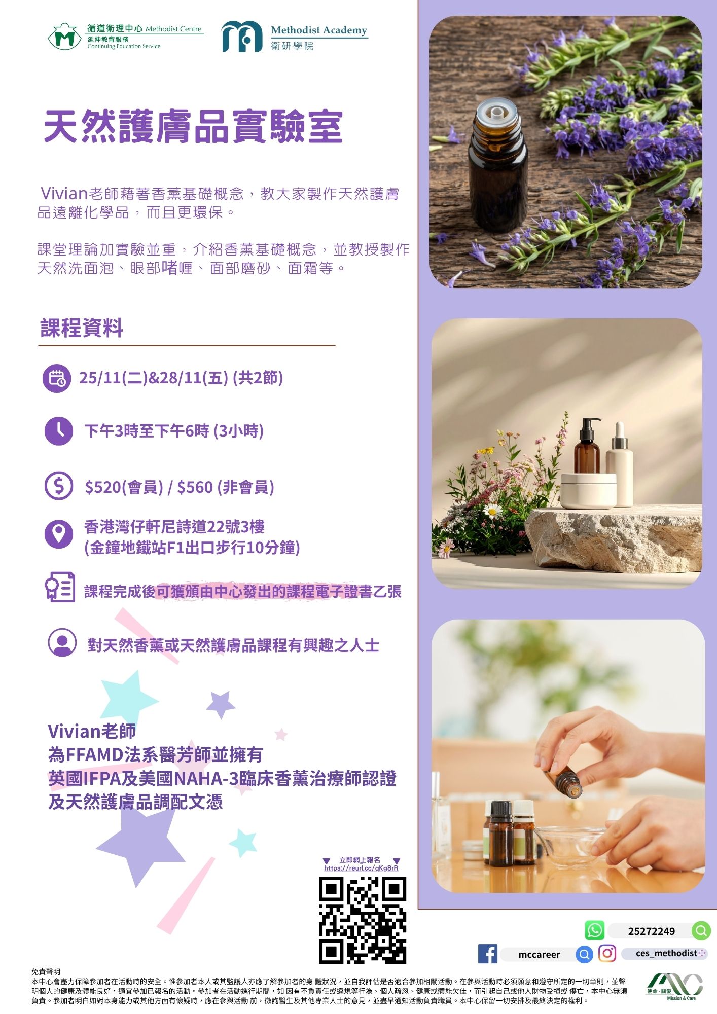 Vivian老師藉著介紹香薰基礎概念透過理論與實驗並重的方式,教援大家製作天然洗面泡、眼部啫喱、面部磨砂、面霜等天然護膚品遠離化學品.