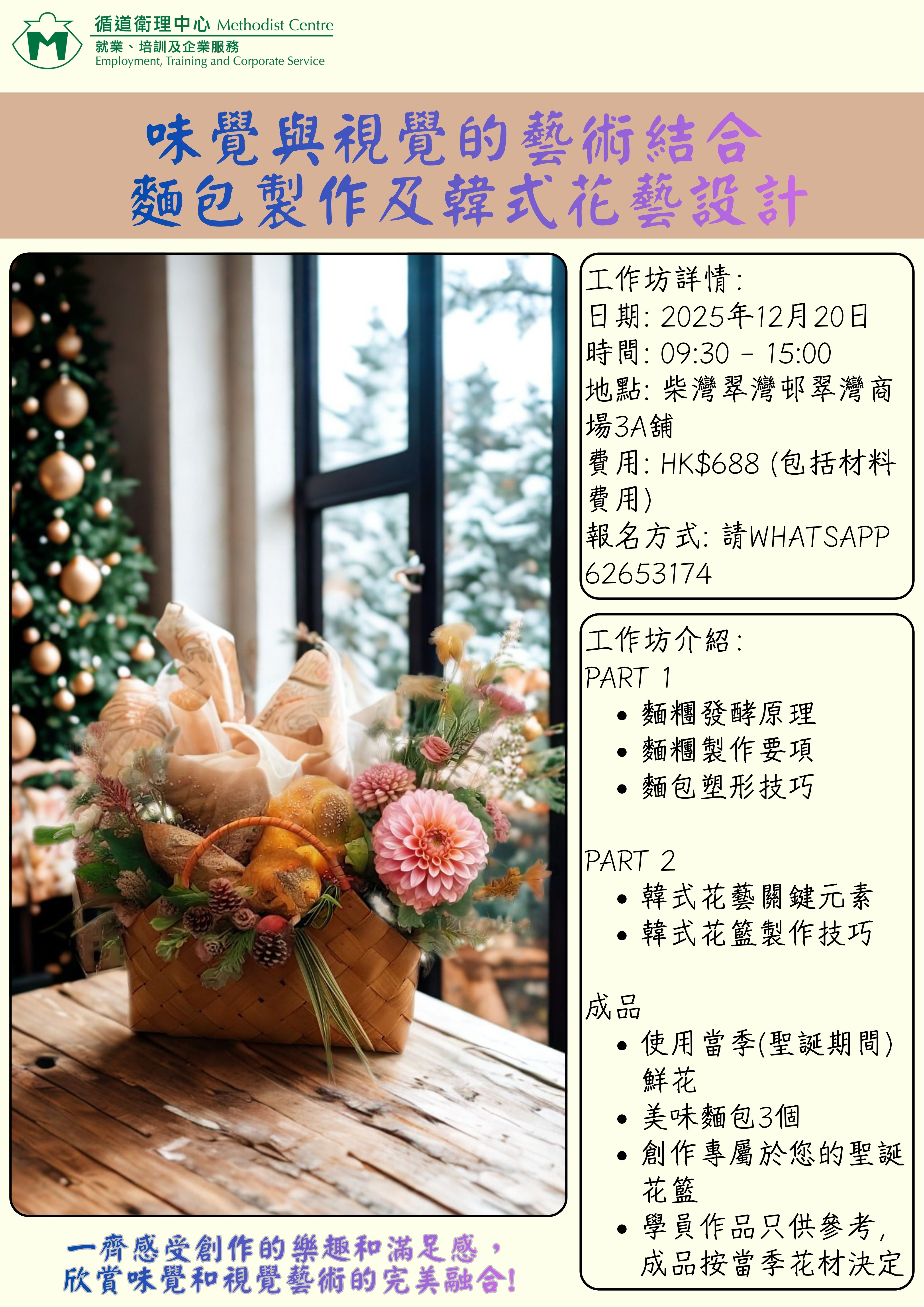 您將學習韓式花藝技巧,運用季節性鮮花,搭配色彩與造型,創作富有層次感的聖誕花籃。